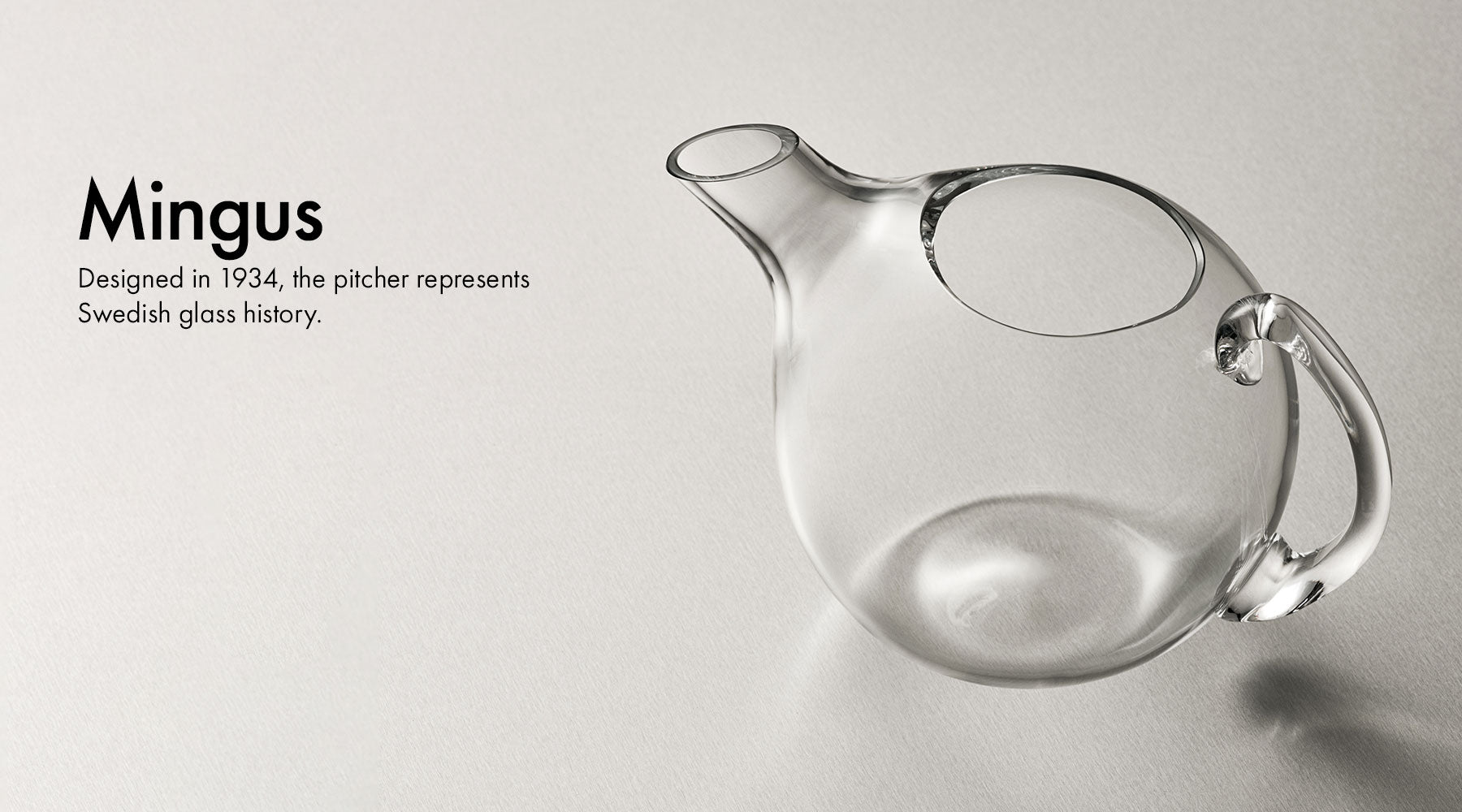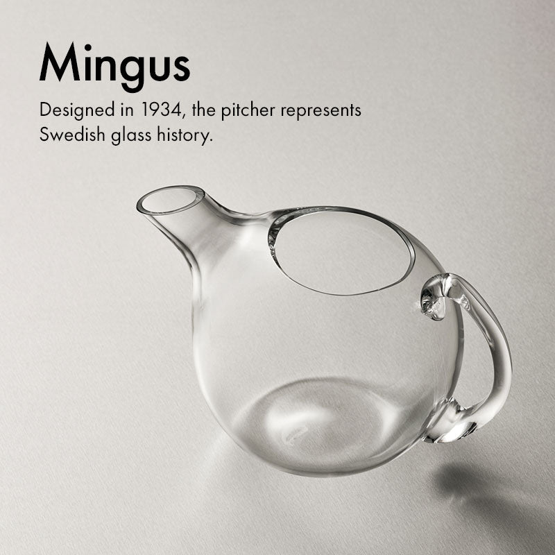 Mingus by Vicke Lindstrand is an iconic item of glass from Sweden. It was designed for Orrefors in 1934 and has been mouth-blown in the region of Småland ever since. Mingus was originally launched as a martini pitcher but is used just as often for ice water, iced tea, and other cold beverages. The pitcher has won numerous design awards and often represents Swedish glass design at national and international museums.