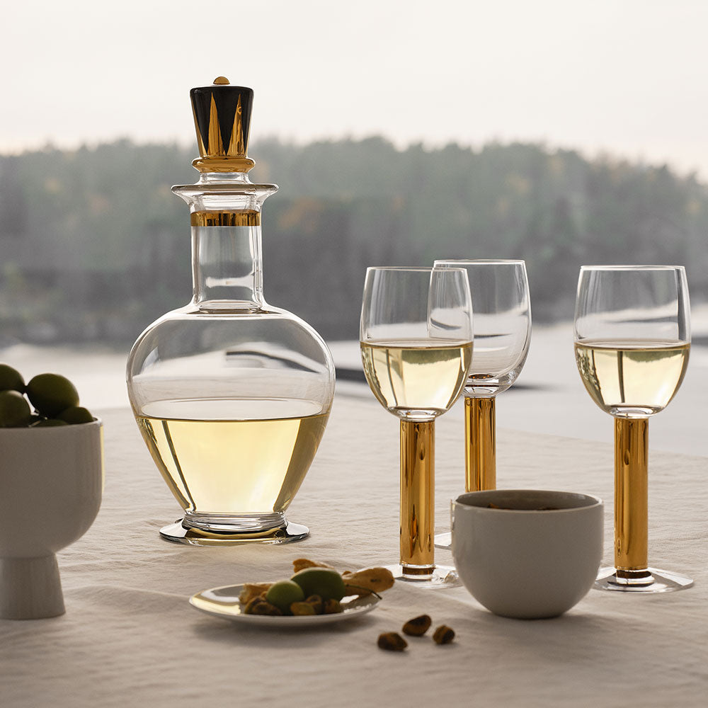 Gunnar Cyrén is one of the great designers of Swedish glass history. In 1991, he created the Nobel set, which is still used at the annual Nobel Banquet in Stockholm City Hall. It is a prestigious event where invited award winners from different countries in the world celebrate with over 1,000 guests, including members of the Swedish royal family, politicians, scientists, and artists. The collection is mouth-blown in Sweden and hand-painted with details in real 21 karat gold, and includes wine glasses, beer glasses, champagne glasses, a pitcher, and a carafe. The entire Nobel set is now a highly coveted collector’s item, both in Sweden and internationally.