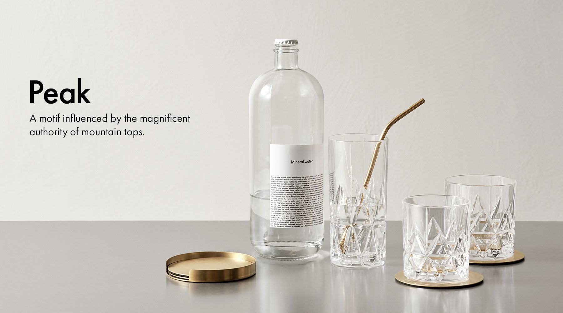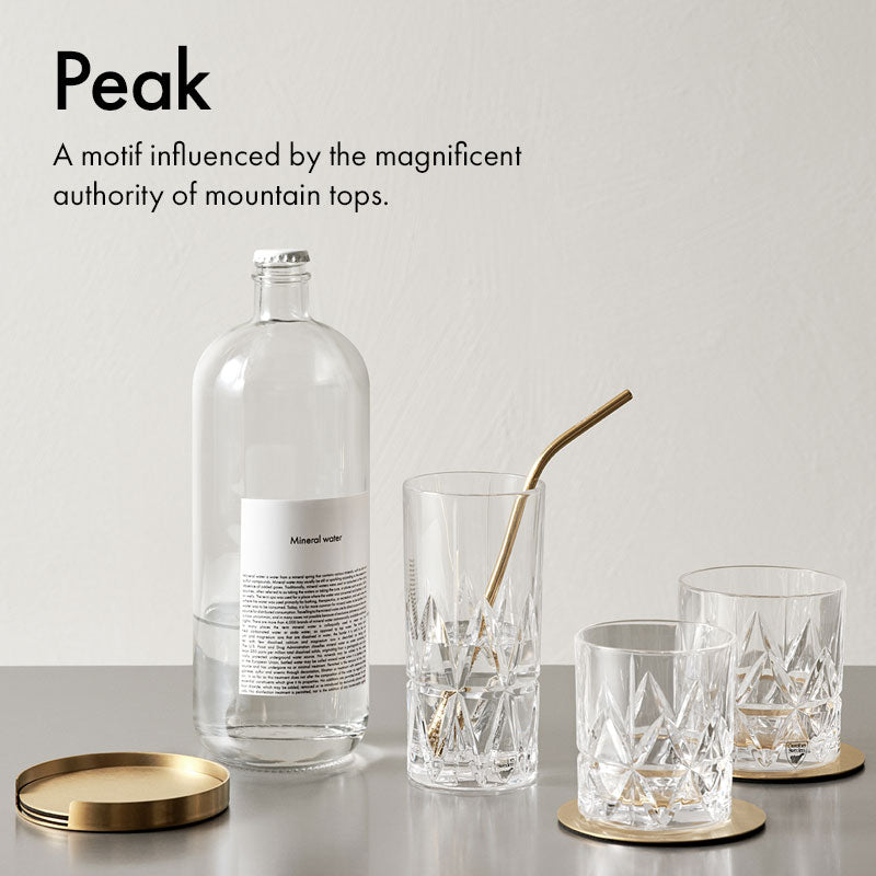 Having grown up in North Karelia, Finland, Martti Rytkönen has an inescapable relationship with nature. In the barware collection Peak, the designer combines the magnificent authority of mountain tops with the beautiful, refractive qualities of cut glass. Orrefors' Peak includes Old Fashioned glasses in two sizes, a Highball glass, and coasters and straws in classic warm-toned metal. The collection was first launched in 2018.