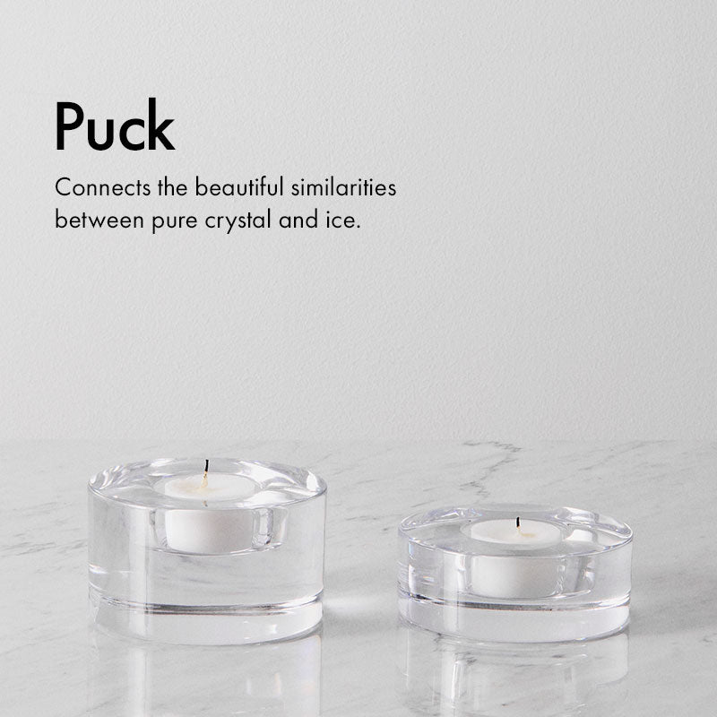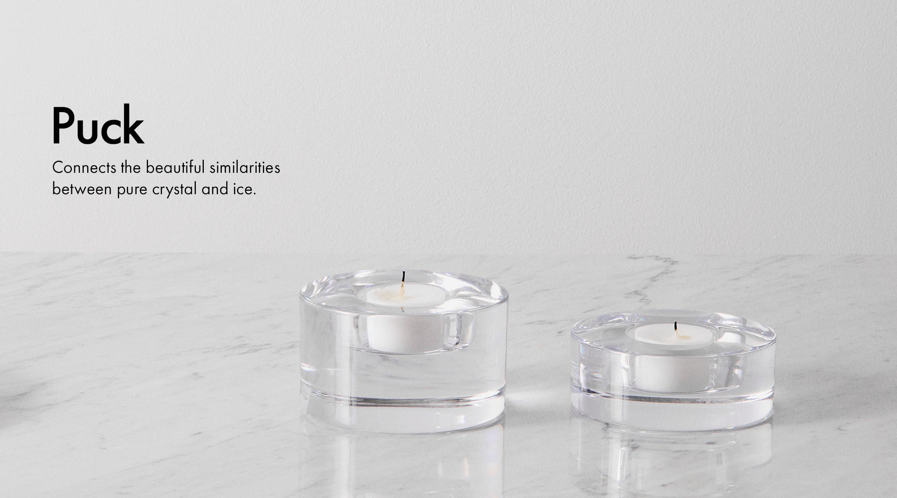 With the candle holder Puck, designer Lena Bergström connects the similarities between pure crystal and ice. Her inspiration comes from her childhood fishing trips to frozen lakes amidst the north of Sweden's mountainous landscapes. The shape and size of the candle holder relate to the diameter of an ice drill and the incredible precision with which it drills through thick, solid ice. Puck from Orrefors comes in two designs – one tall and one low. The collection was first launched in 1999.