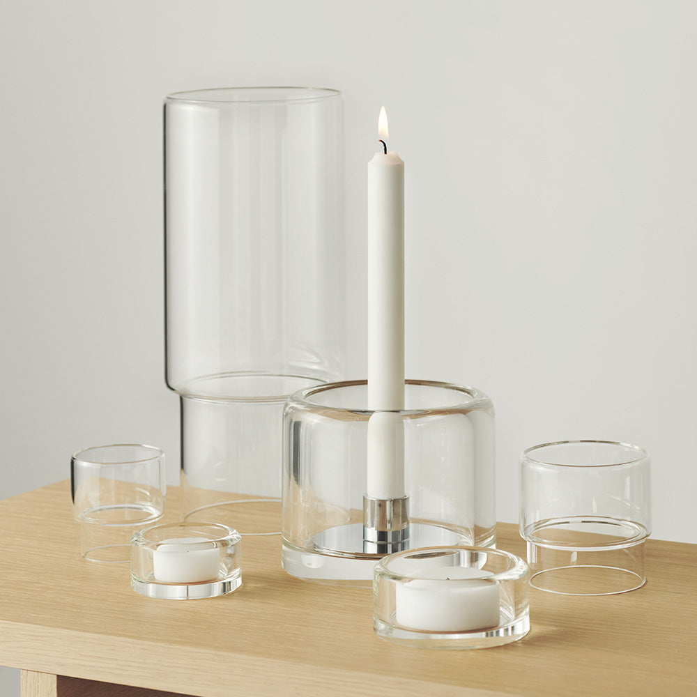 Tou, designed by Claesson Koivisto Rune and Orrefors, shows how an established function can take on a new form. Inspired by the classic hurricane lamp, the designers have divided Tou into two components: a foundation in thicker glass and a tall, thin-glass cylinder placed inside. The different layers and thicknesses reflect the room and the candlelight in a way that makes the eye linger. Set the table with Tou both outdoors and indoors. The candles are easy to light when you take off the top. And with the tall glass in place, the flame burns quietly, even in an evening breeze.